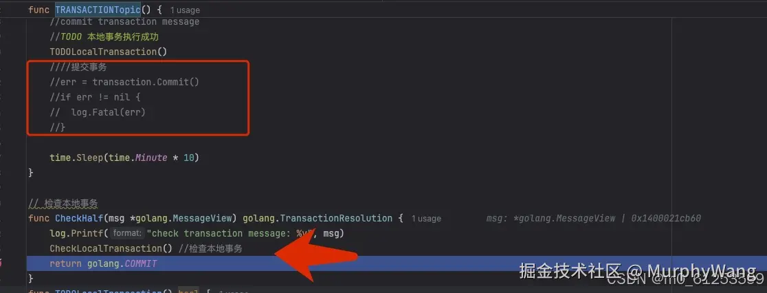 第三步:当我们注释掉第三步commit代码,模拟提交事务异常(模拟commit事务消息失败)