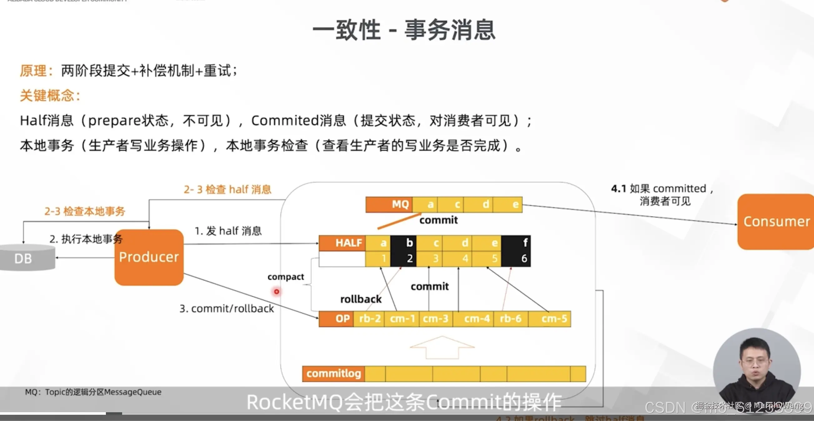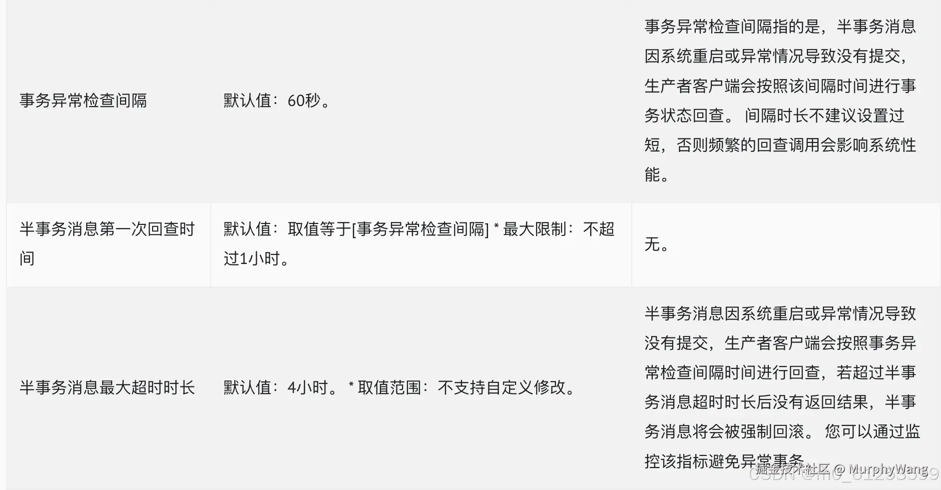 UNKNOWN // 暂时无法判断状态,等待固定时间以后Broker端根据回查规则向生产者进行消息回查,超过半事务最大超时时长,消息主动回滚 COMMIT //提交事务,允许消费者消费该消息 ROLLBACK //回滚事务,消息将被丢弃不允许消费。