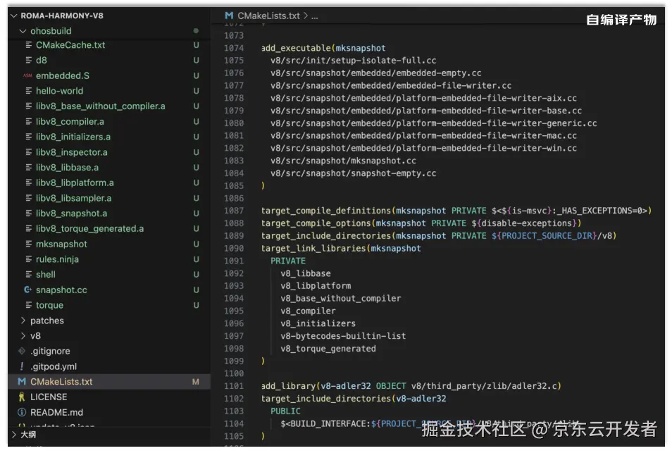V8虚拟机移植到鸿蒙系统是一个动态化必备的高技术门槛卡点任务,若无法突破此任务,动态化鸿蒙系统的跨端则无法实现。 然而V8是一个近千万级代码的庞大仓库,需要掌握CMake、Clang、LLVM、Ninja等一系列交叉编译知识(嵌入式范畴),对于应用开发者是一个巨大的挑战,通过动态化小组成员的攻坚克难,现已掌握了V8虚拟机交叉编译移植技术。
