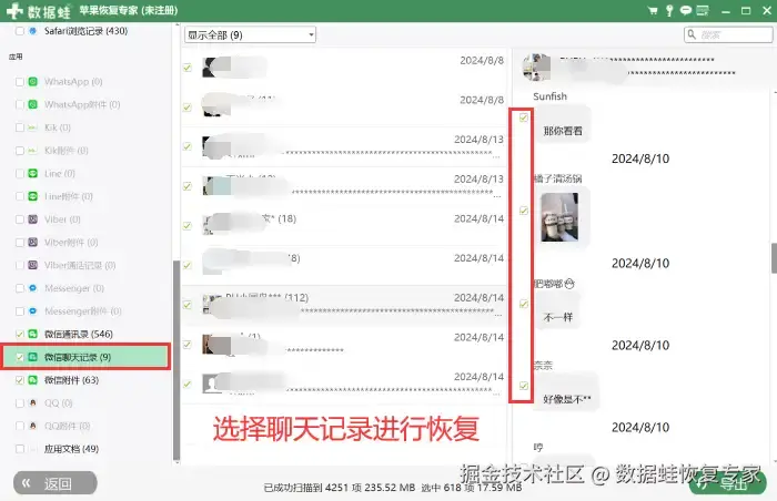 步骤3:扫描完成后,在扫描的界面找到您需要恢复的聊天记录信息,并勾选进行恢复后导出即可。