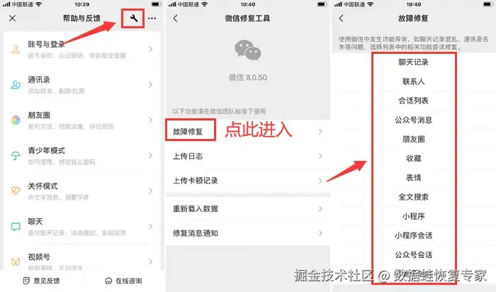 恢复聊天记录方法一:利用微信内置的故障修复功能