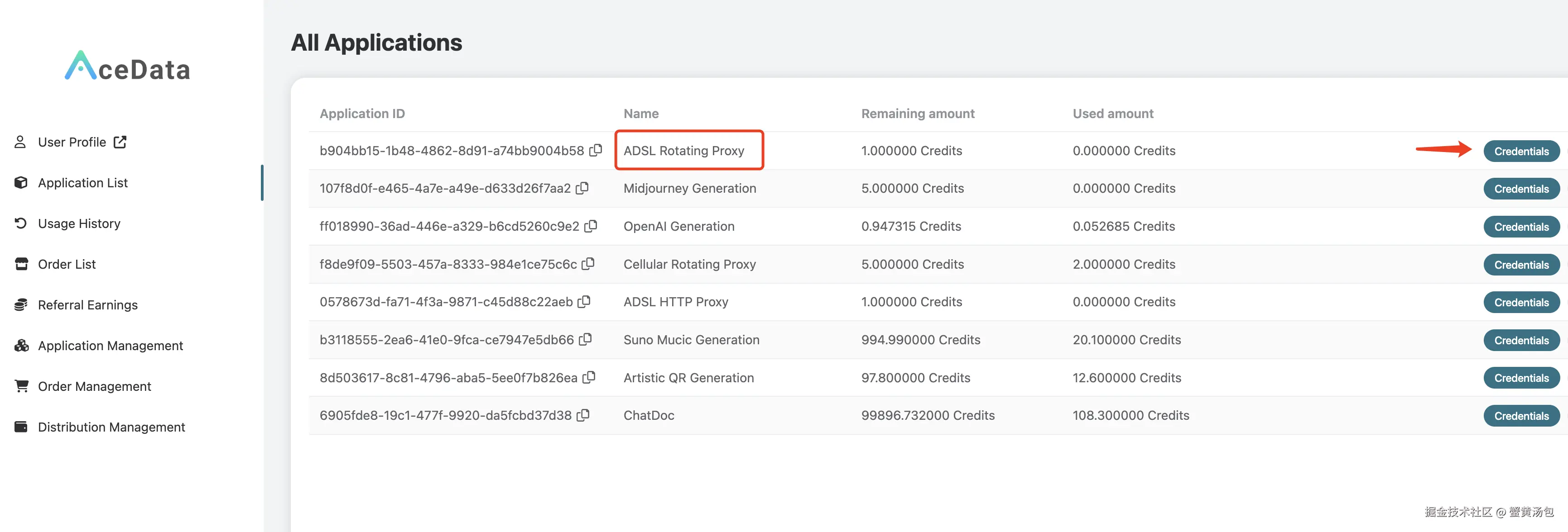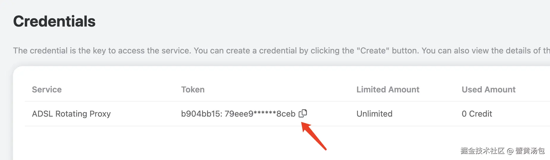 点击 「Credentials」,即可查看使用 ADSL 代理服务的用户名及密码,以冒号分隔,其中用户名是 8 位,密码是 32 位,如图所示: