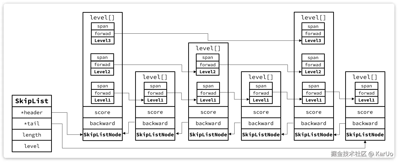 可以看到SkipList主要属性是header和tail,也就是头尾指针,因此它是支持双向遍历的。