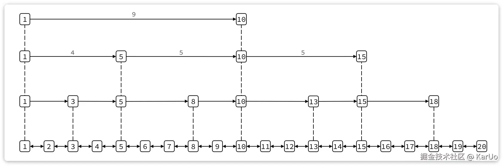 这种多级指针的查询方式就避免了传统链表的逐个遍历导致的查询效率下降问题。在对有序数据做随机查询和排序时效率非常高。