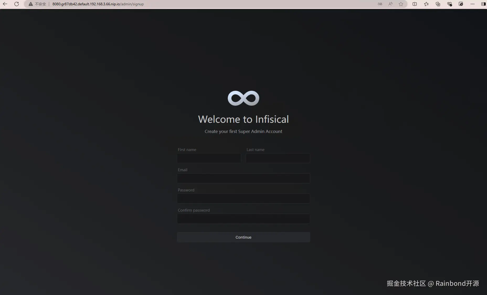 这时点击访问按钮即可访问到 Infisical 注册页面,开始管理您的密钥吧~