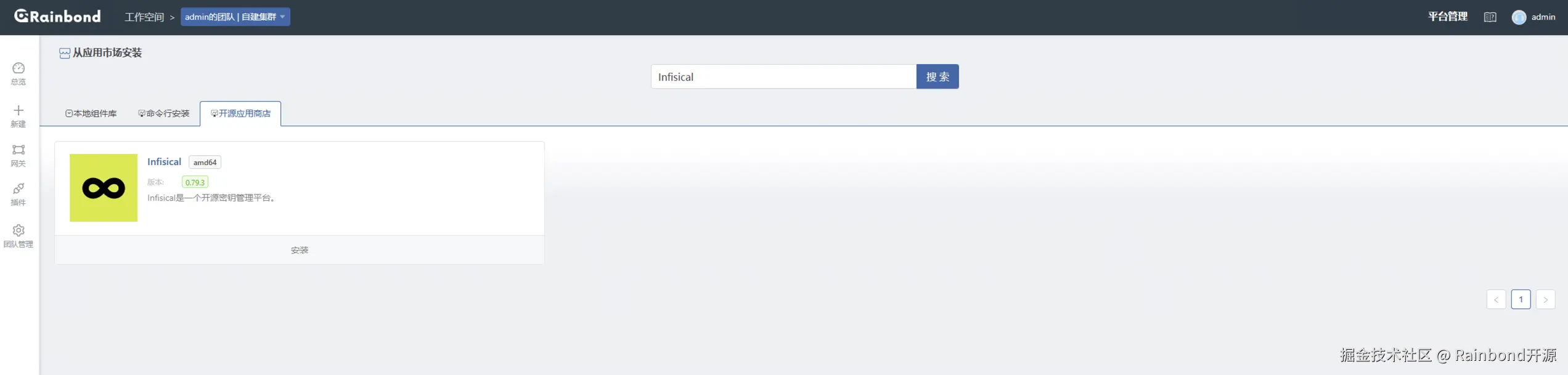 部署完成后,进入 Rainbond 平台,选择通过应用市场部署,在开源应用商店中搜索Infisical 并进行一键安装。