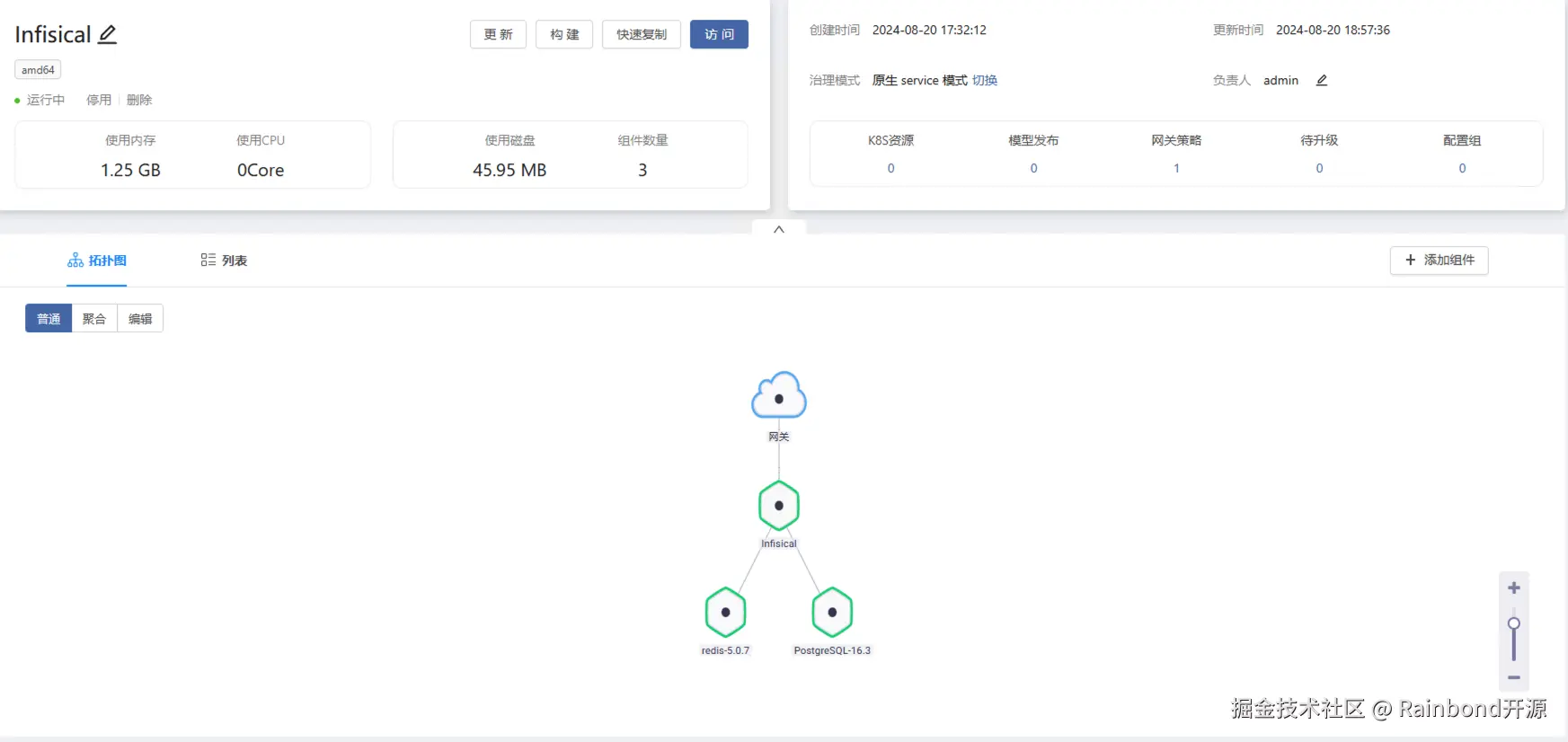 部署完成后拓扑图如下,Rainbond 的 Infisical 应用模板提供了生产可用的 Infisical,包含 infisical、Postgres、Redis 三个服务。