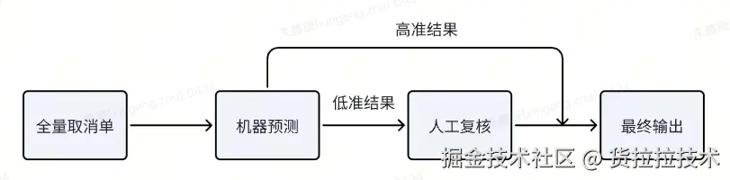 所有取消单都会先经过机器,机器预测命中哪些细则,高准确率细则会直接输出,低准确率细则会经过人工复核再输出。