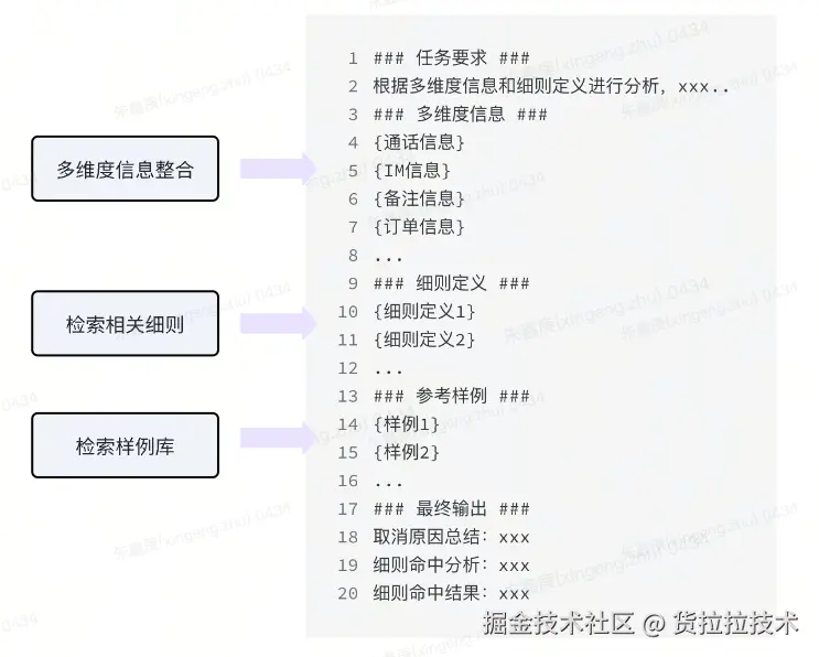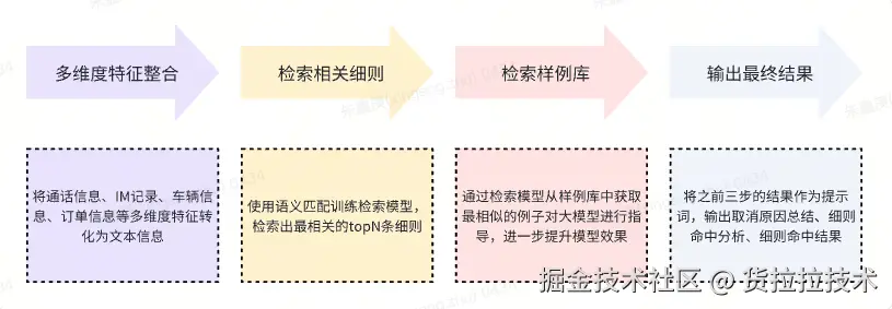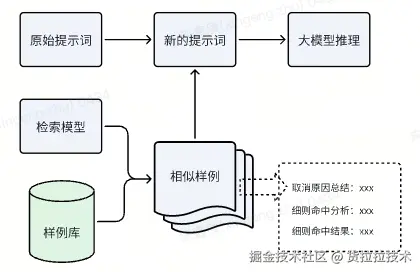 由于文本信息通常较长且包含大量细节,我们在将样例引入提示词时会去除这部分内容,只保留取消原因总结、细则命中分析和细则命中结果。随后,我们将这些样例信息与原始提示词进行拼接,形成一个更加清晰且有针对性的提示词。
