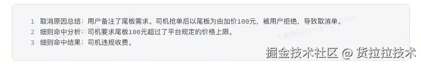 我们在输出结果中加入了取消原因总结、细则命中分析作为中间过程,一是使用COT的模式去缓解大模型的幻觉问题,让输出结果更稳定。二是提供了更多可解释的信息,便于业务方去提升司机体验。