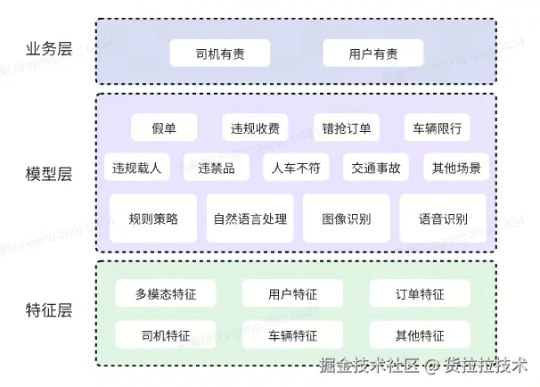 2. 模型层:通过规则策略、自然语言处理、图像识别、语音识别等不同方法,预测不同的判责场景和细则。