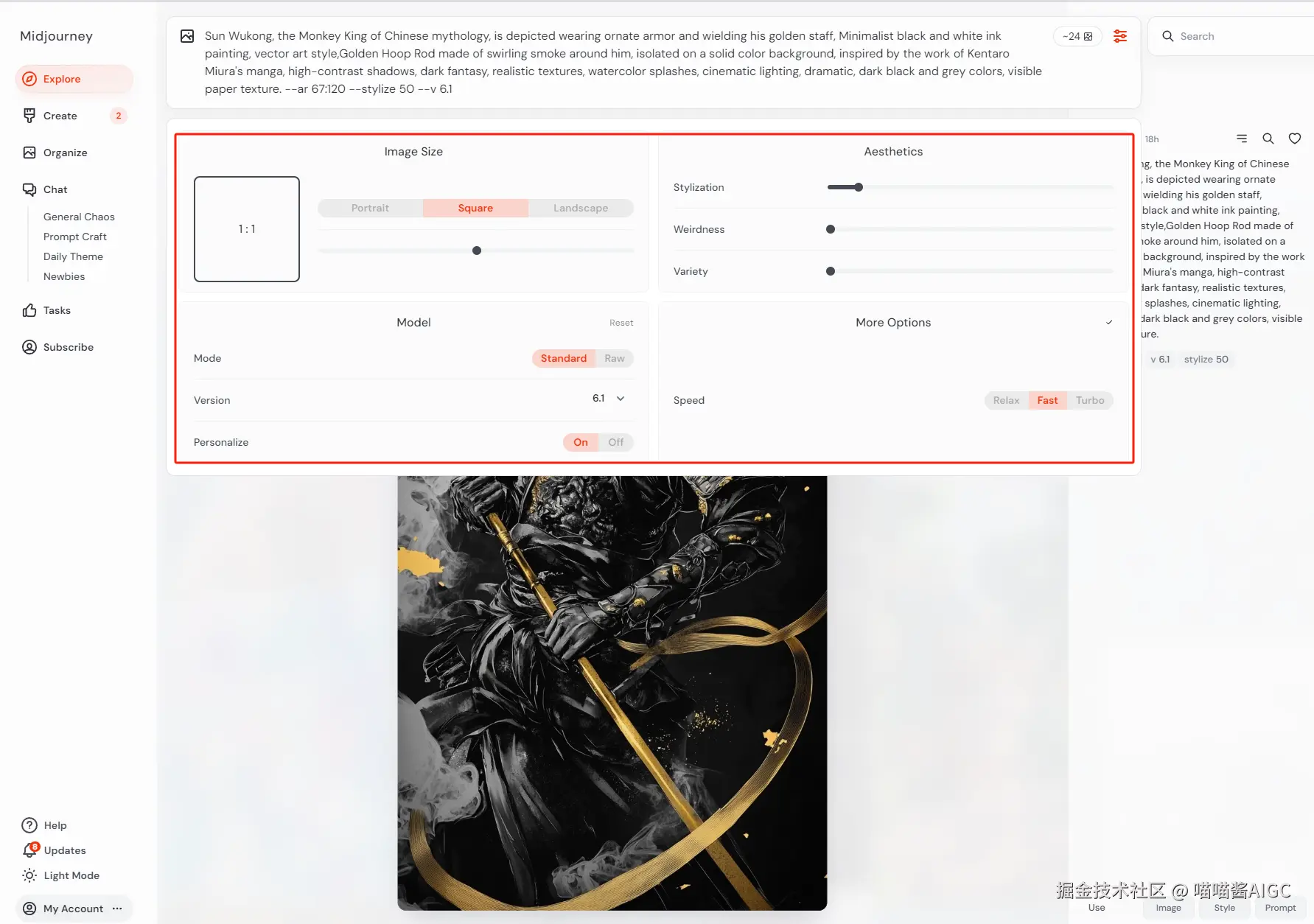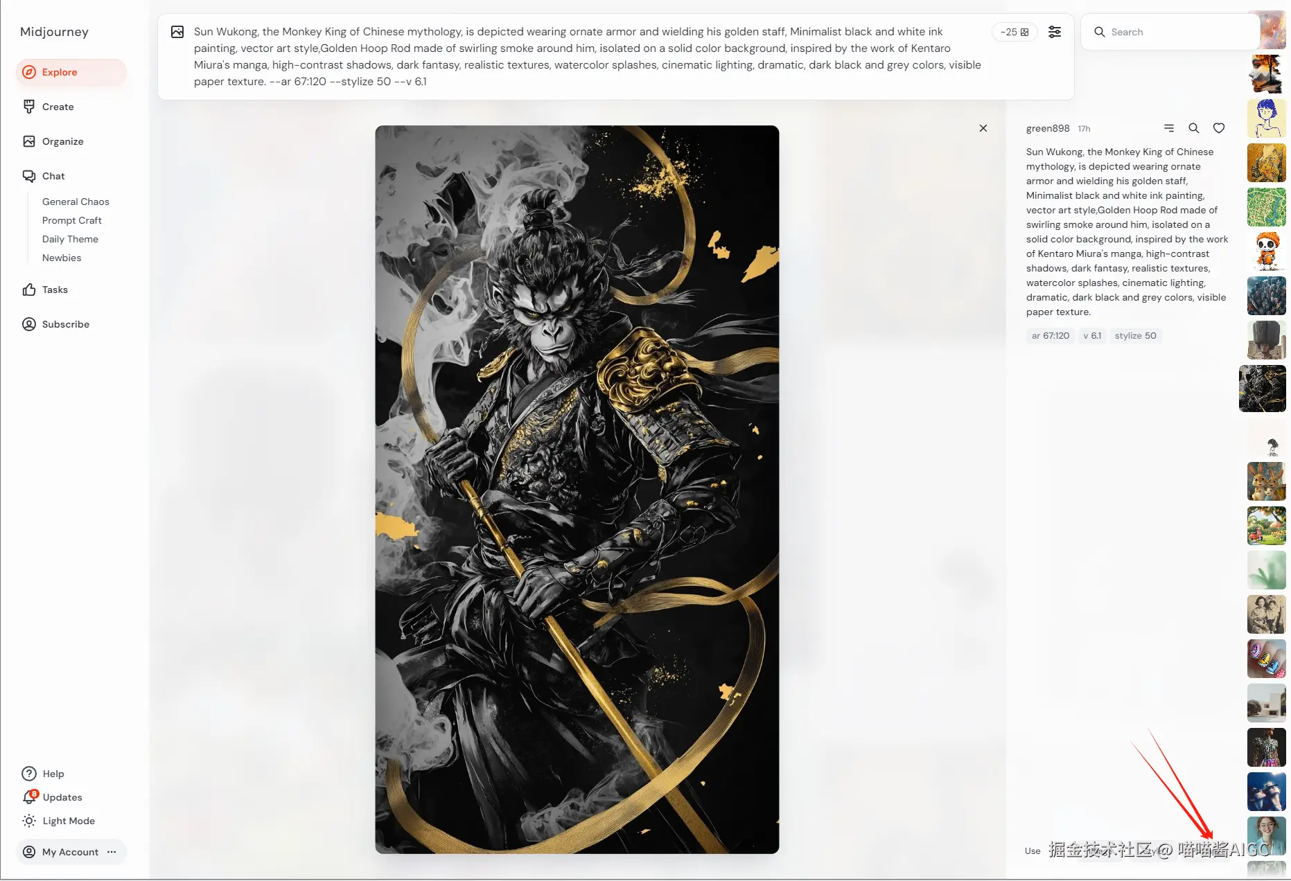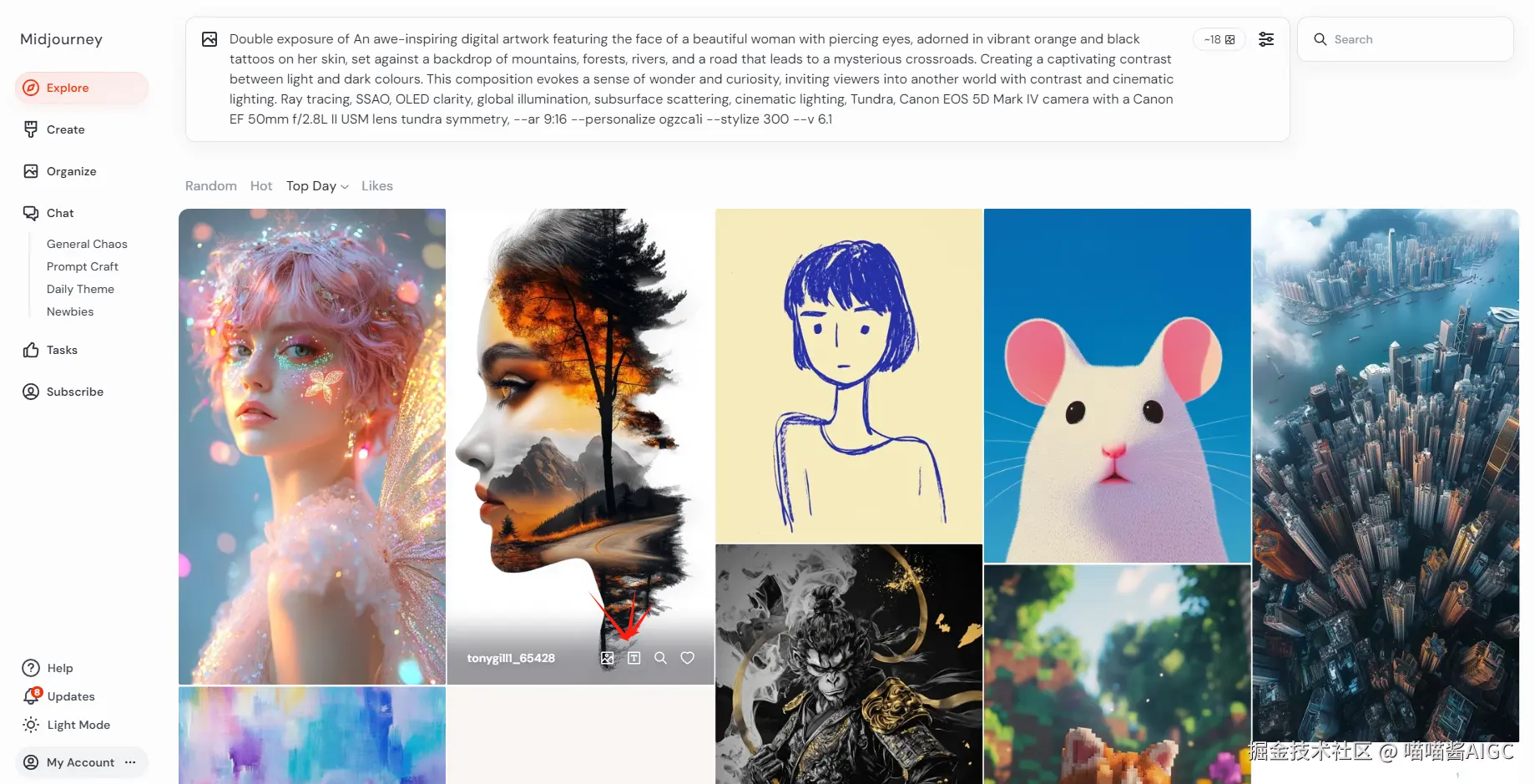 如果你不知道画什么,可以在探索界面找灵感,找你想要参考的图片,点击图片里面,直接选择提示词,提示词就会直接复制到文本输入框里。这是它社区提示词复用的一个优点。