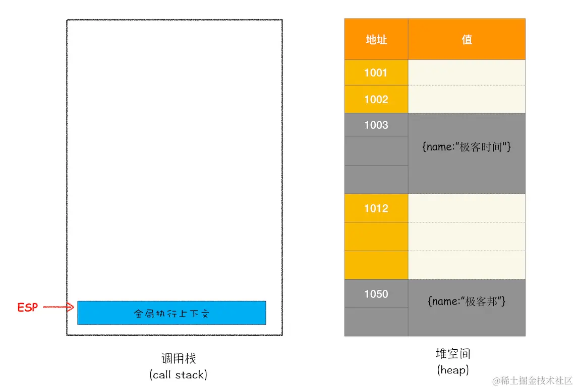 通过上面的讲解,我想现在你应该已经知道,当上面那段代码的 foo 函数执行结束之后,ESP 应该是指向全局执行上下文的,那这样的话,showName 函数和 foo 函数的执行上下文就处于无效状态了,不过保存在堆中的两个对象依然占用着空间,如下图所示: