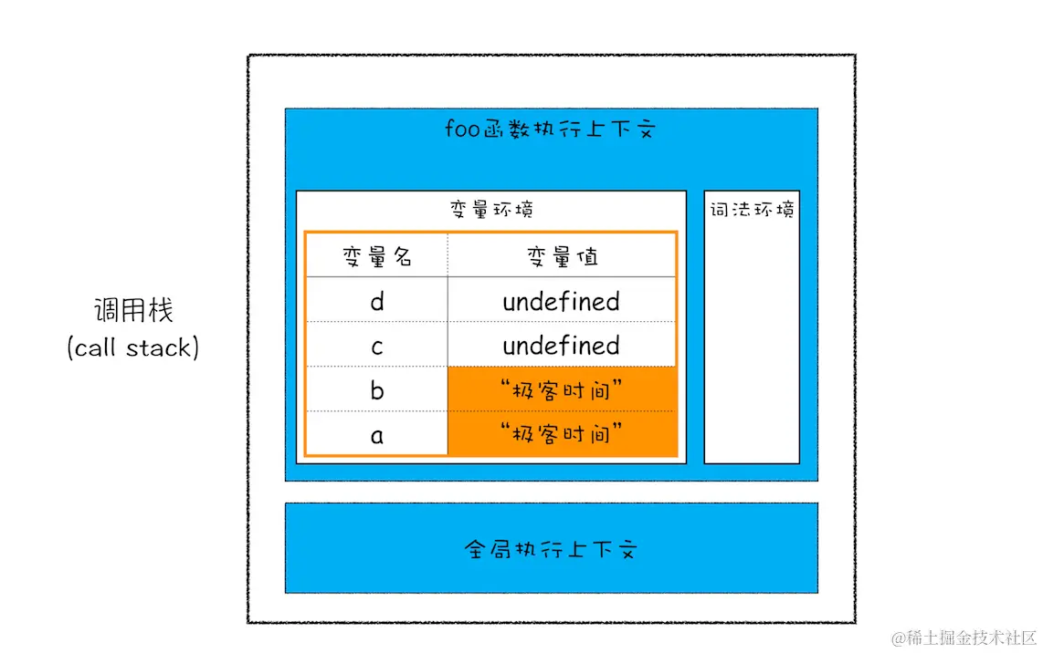 从图中可以看出来,当执行到第 3 行时,变量 a 和变量 b 的值都被保存在执行上下文中,而执行上下文又被压入到栈中,所以你也可以认为变量 a 和变量 b 的值都是存放在栈中的。