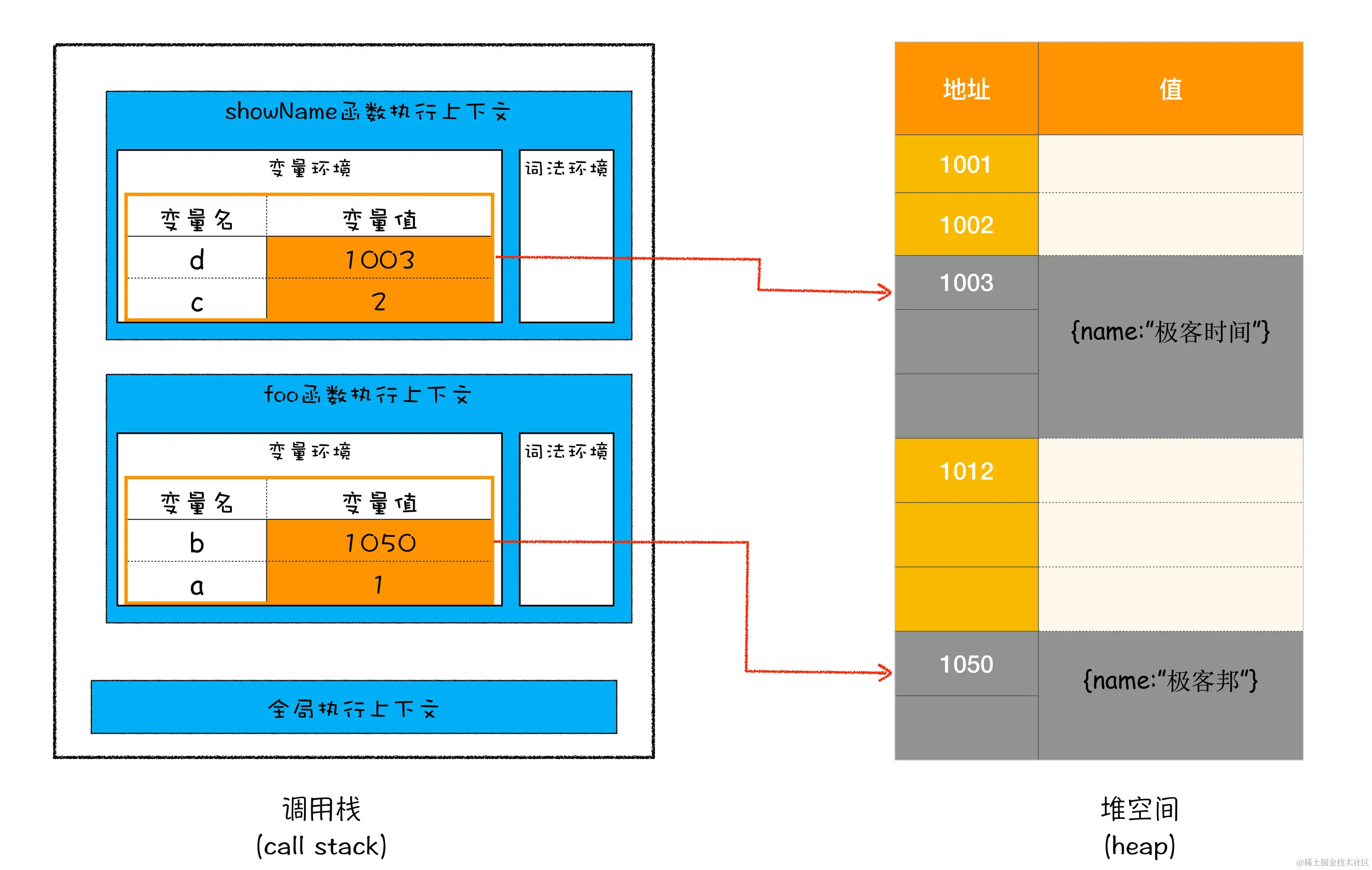 接下来继续执行第 4 行代码,由于 JavaScript 引擎判断右边的值是一个引用类型,这时候处理的情况就不一样了,JavaScript 引擎并不是直接将该对象存放到变量环境中,而是将它分配到堆空间里面,分配后该对象会有一个在“堆”中的地址,然后再将该数据的地址写进 c 的变量值,最终分配好内存的示意图如下所示: