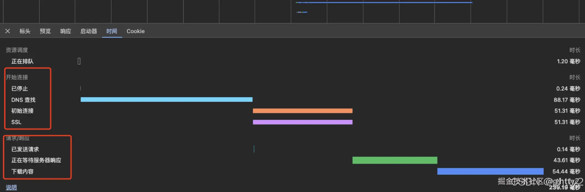 切换到时间tag我们其实可以看到整个请求网络的建立和连接, 在这里我们可以明确的查看某个请求/响应的时间(这里仅供参考,具体性能问题使用lighthouse tag去分析会更好)