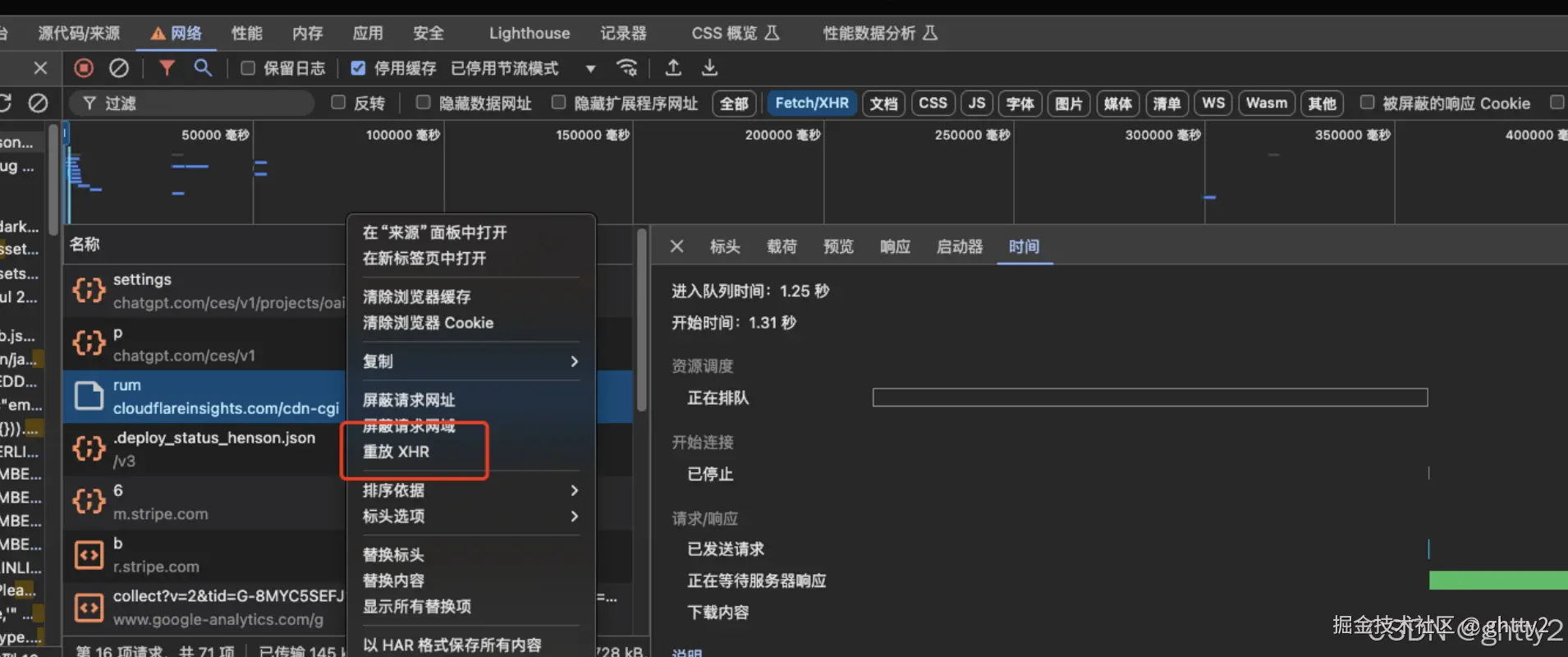 有时候我们需要快速的验证一个ajax请求, 可以在开发工具中这样, 点击重放XHR即可