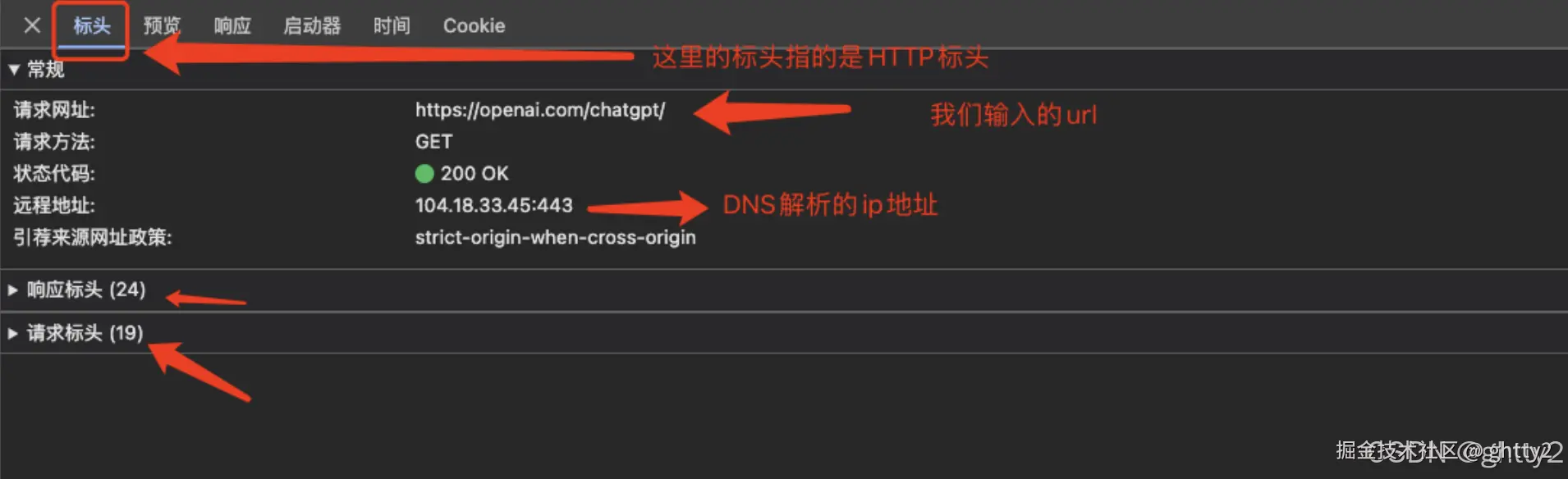 当我们的tag从预览切换到标头时, 这里主要展示的是HTTP标头(这里之后会在网络部分解释), 如下: