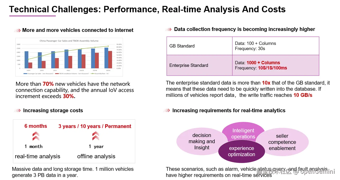 数据分析难:随着用户对服务的期望日益增长,他们对车辆告警、详单查询、故障快速分析等实时性服务的需求也在不断提升。这种趋势迫使厂商不断进行系统技术升级,以确保能够及时响应并满足用户的需求。这种升级的压力也传递到了数据库层面,要求数据库进行技术创新,在面对海量数据和高并发请求时仍能保持快速响应。