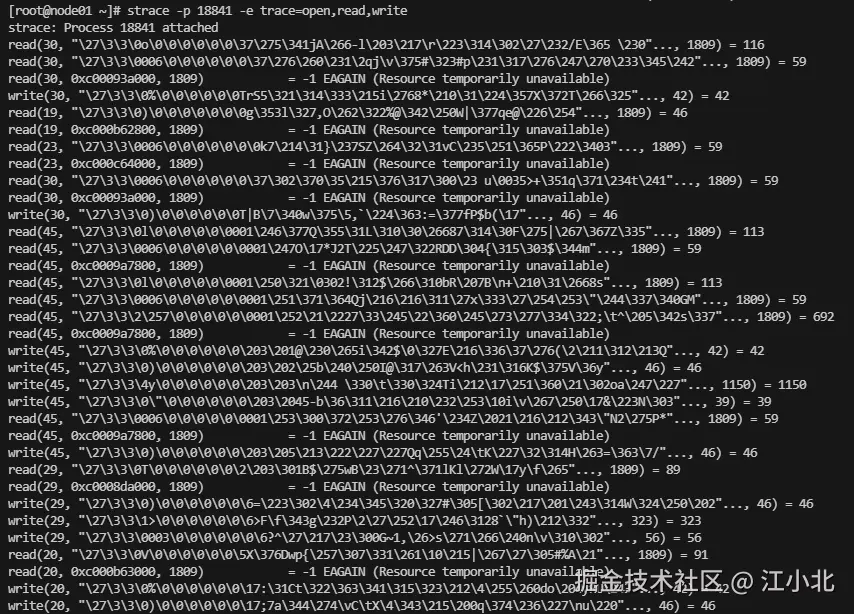 这个命令会输出进程的读写操作,可以清晰地看到进程读写了哪些文件。