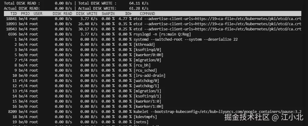 确认硬盘存在繁忙后,接下来,我们需要找出占用硬盘I/O最高的进程,这时候我们就需要用到“iotop”工具了。
