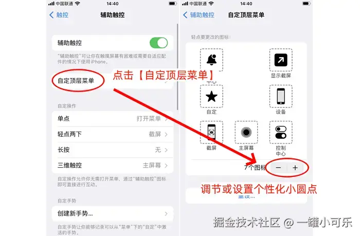 步骤1:在辅助触控设置页面,点击 【自定顶层菜单】,点击【+】 号添加新的操作,或点击 【-】 号删除不需要的操作。