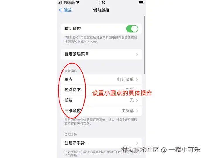 步骤1:在辅助触控设置页面,点击 【自定义操作】。选择【双击】或【长按】 ,然后选择你想要触发的操作。