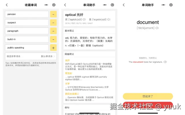 在浏览器端收藏的单词均可同步到微信小程序端,可以随时随地打开小程序背单词,小程序端也支持更多的功能。