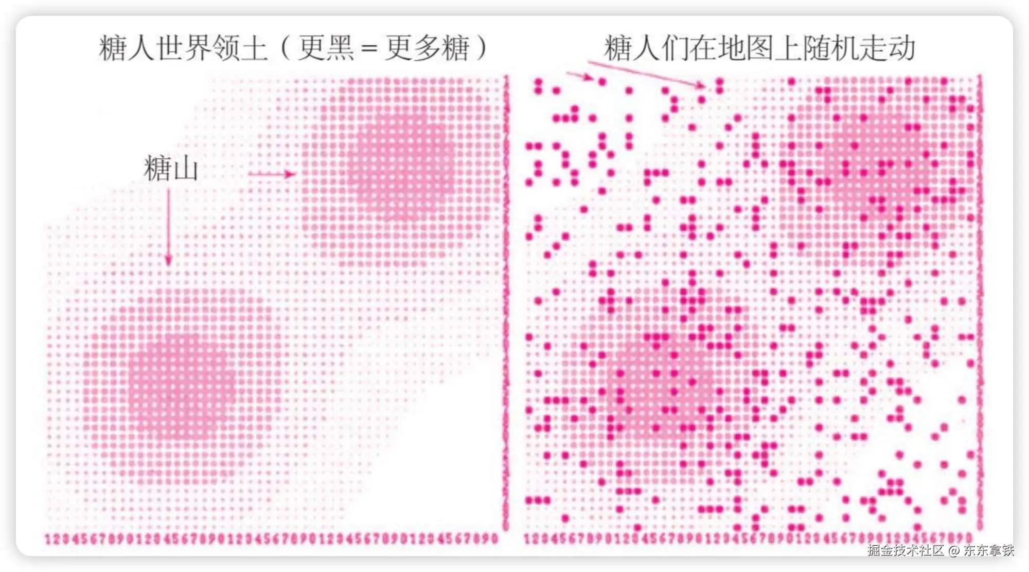 糖在被吃掉以后过一段时间会再长出来。然后他们会随机丢一些小糖人上去——这些小糖人遵循几个简单规则: