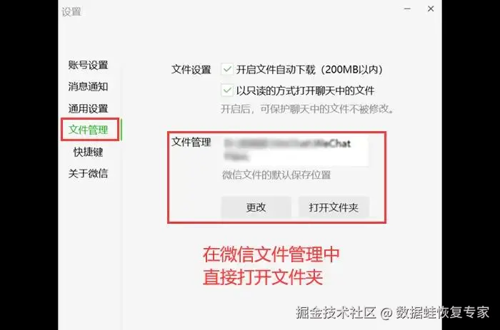 步骤2:在设置中,选择 【文件管理】 ,查看微信文件的默认保存位置,然后点击 【打开文件夹】 ,等待跳转即可。