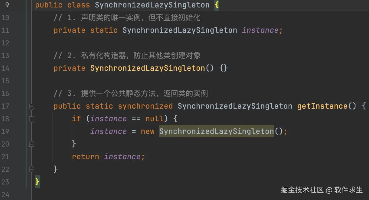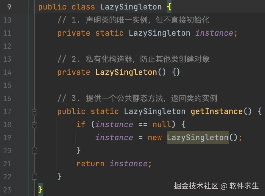 单例模式(Singleton Pattern)的核心思想就是“一个类只有一个实例,并且自行向整个系统提供这个实例。”这个实例一般是通过该类自己创建的。