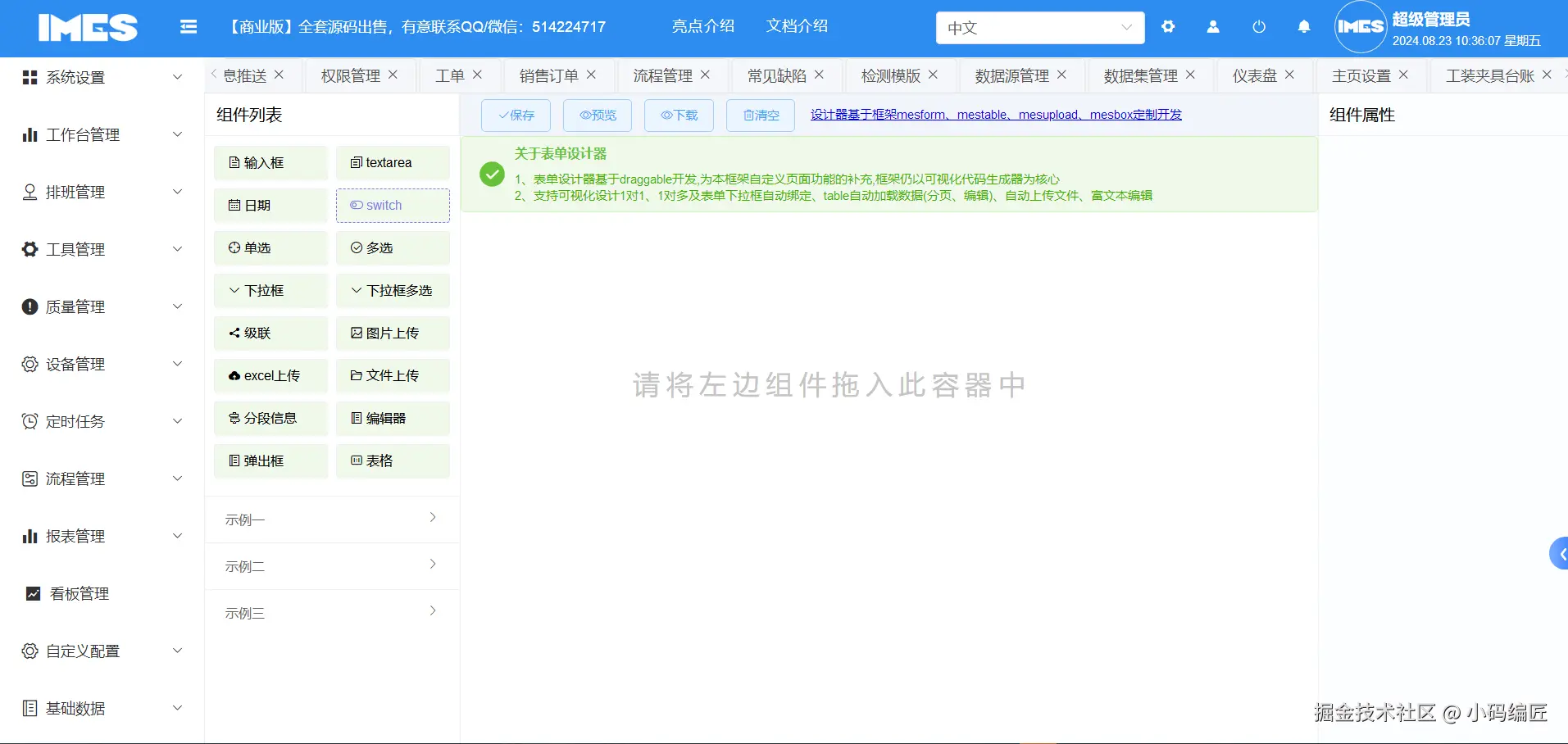智能代码生成:代码生成器能够生成主/从表的前后端业务代码,支持超过30种属性的在线配置。