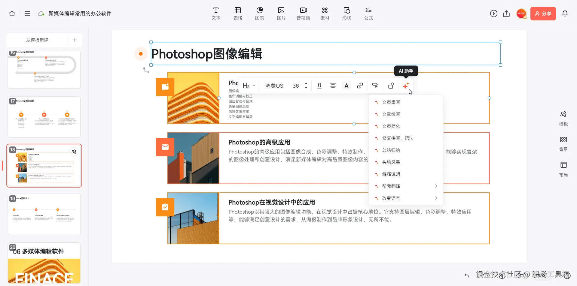 博思AIPPT内置的多功能AI助手,为我们提供了强大的文本优化功能。它支持文案重写、文章续写、文案简化、修复拼写和语法、总结归纳、头脑风暴、解释说明、翻译、改变语气等多种功能,满足了我们在不同场景下的需求。