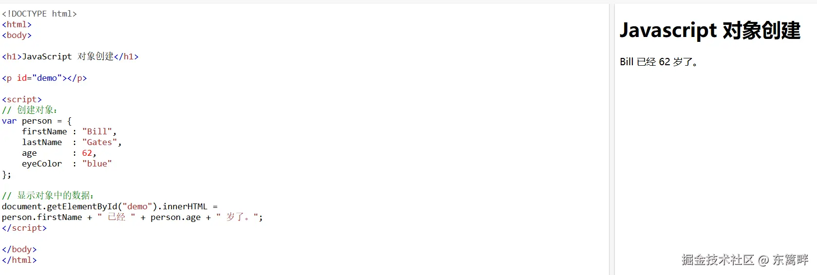 var person = {firstName:"Bill", lastName:"Gates", age:62, eyeColor:"blue"};