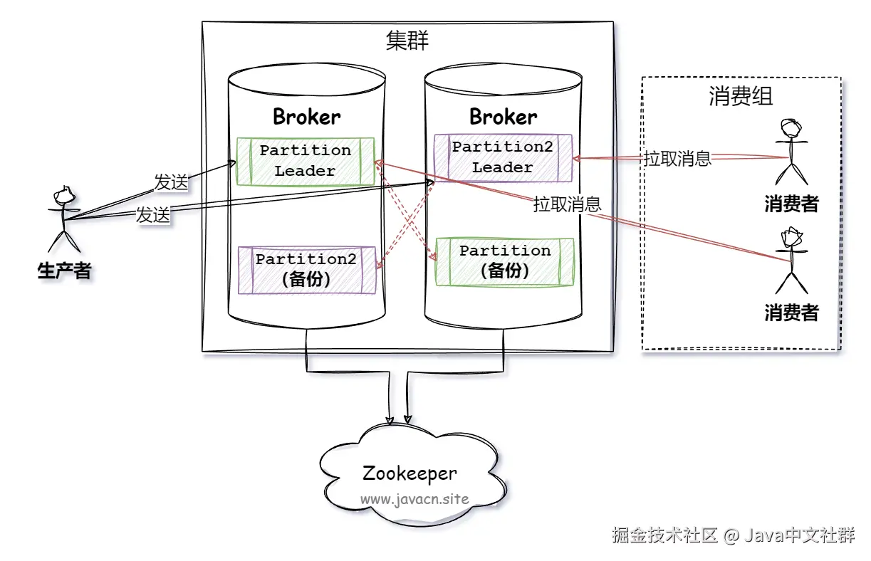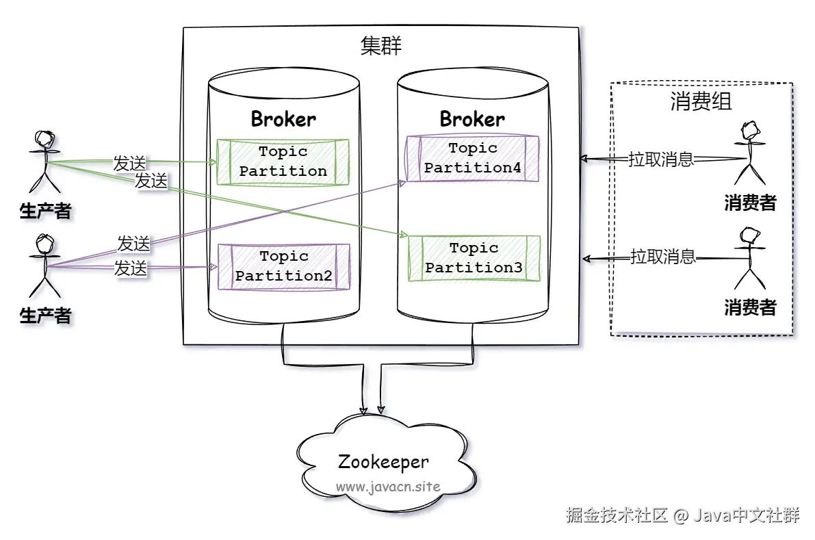 - Zookeeper:用于管理 Broker 集群的元数据,如分区分配、领导者选举、消费者组和消费者偏移量等信息等。