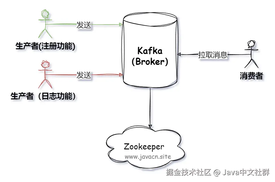 - Producer(生产者):消息发送方,生产者负责创建消息,然后将其投递到 Kafka(Broker)中。
