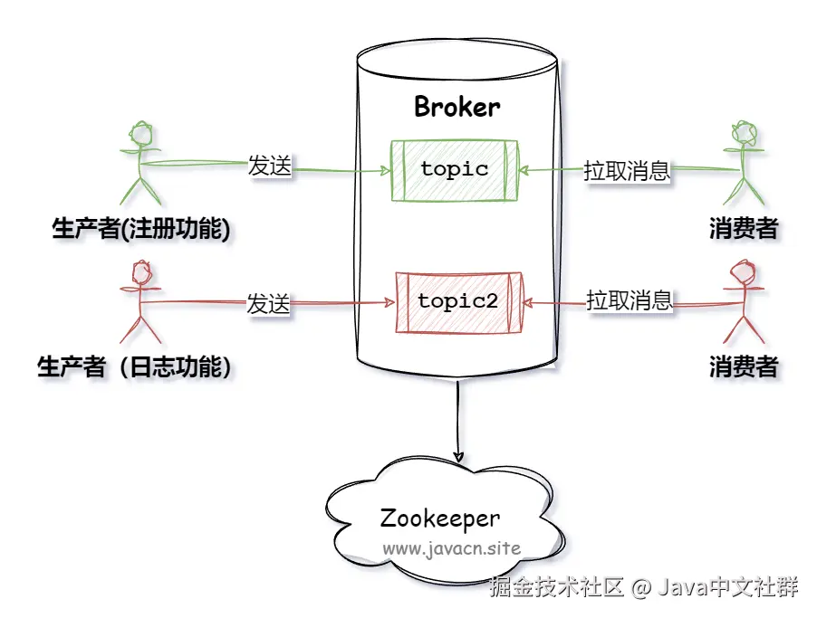 - 主题(Topic):消息的逻辑分类,生产者将消息发送到特定的主题,消费者从特定的主题订阅消息。