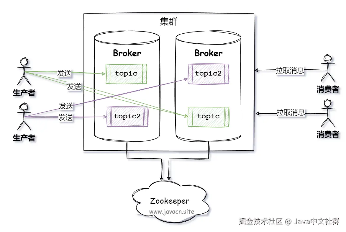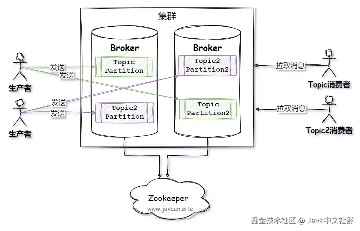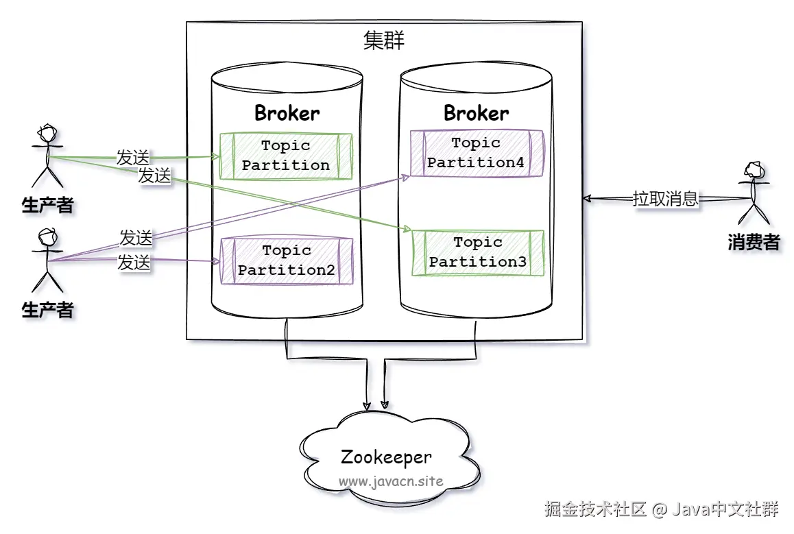 - 生产者(Producer):负责将消息发送到 Kafka 集群。