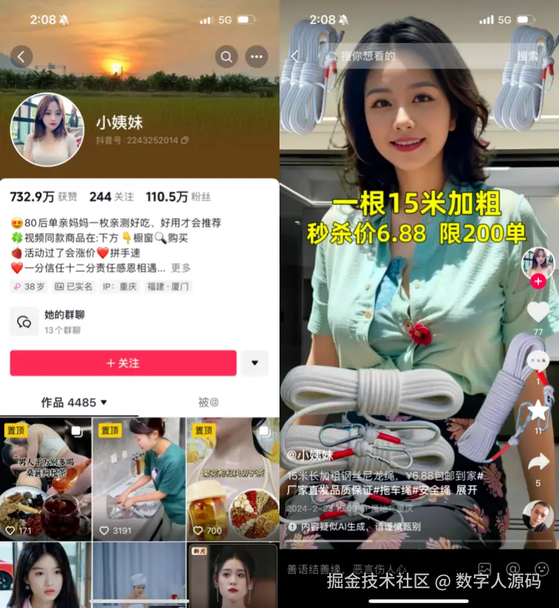 “@小姨妹”,坐拥110万粉丝,其设定为励志的80后单亲妈妈抖音创业者,专注于直播聊天与带货。令人瞩目的是,该账号所有视频均由AI数字人精心打造,细腻肌肤,不少视频下方也被平台标注为“内容疑似AI生成”。