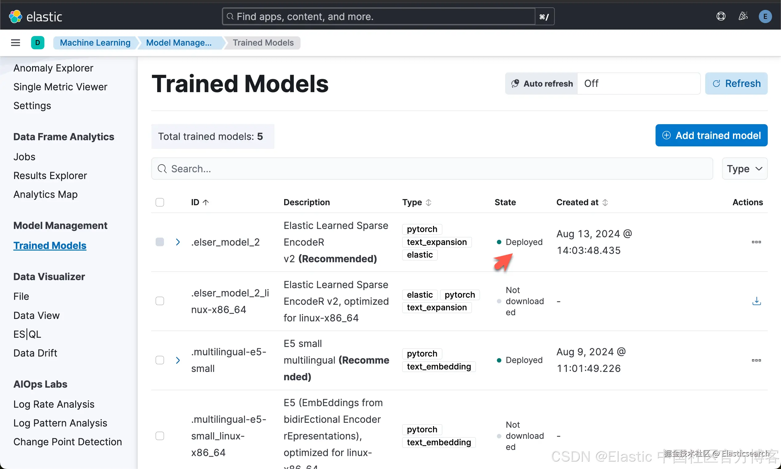 注意:使用 Kibana 控制台时,你可能会在响应中看到 502 bad gateway 错误。此错误通常仅反映超时,而模型在后台下载。你可以在机器学习 UI 中检查下载进度。如果使用 Python 客户端,你可以将超时参数设置为更高的值。