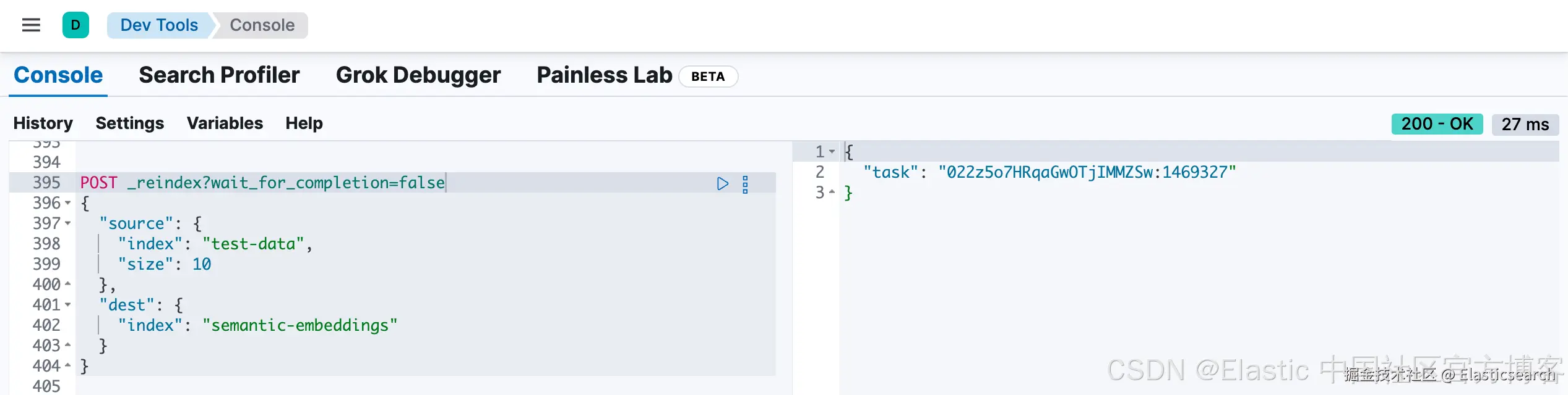 通过将数据从 test-data 索引重新索引到 semantic-embeddings 索引,从文本创建嵌入。content 字段中的数据将重新索引到目标索引的 content 字段中。内容字段数据将作为索引映射创建步骤中设置的 copy_to 参数的结果复制到 semantic_text 字段。复制的数据将由与 semantic_text 语义文本字段关联的推理端点处理。