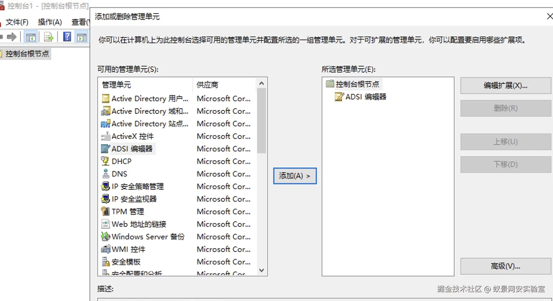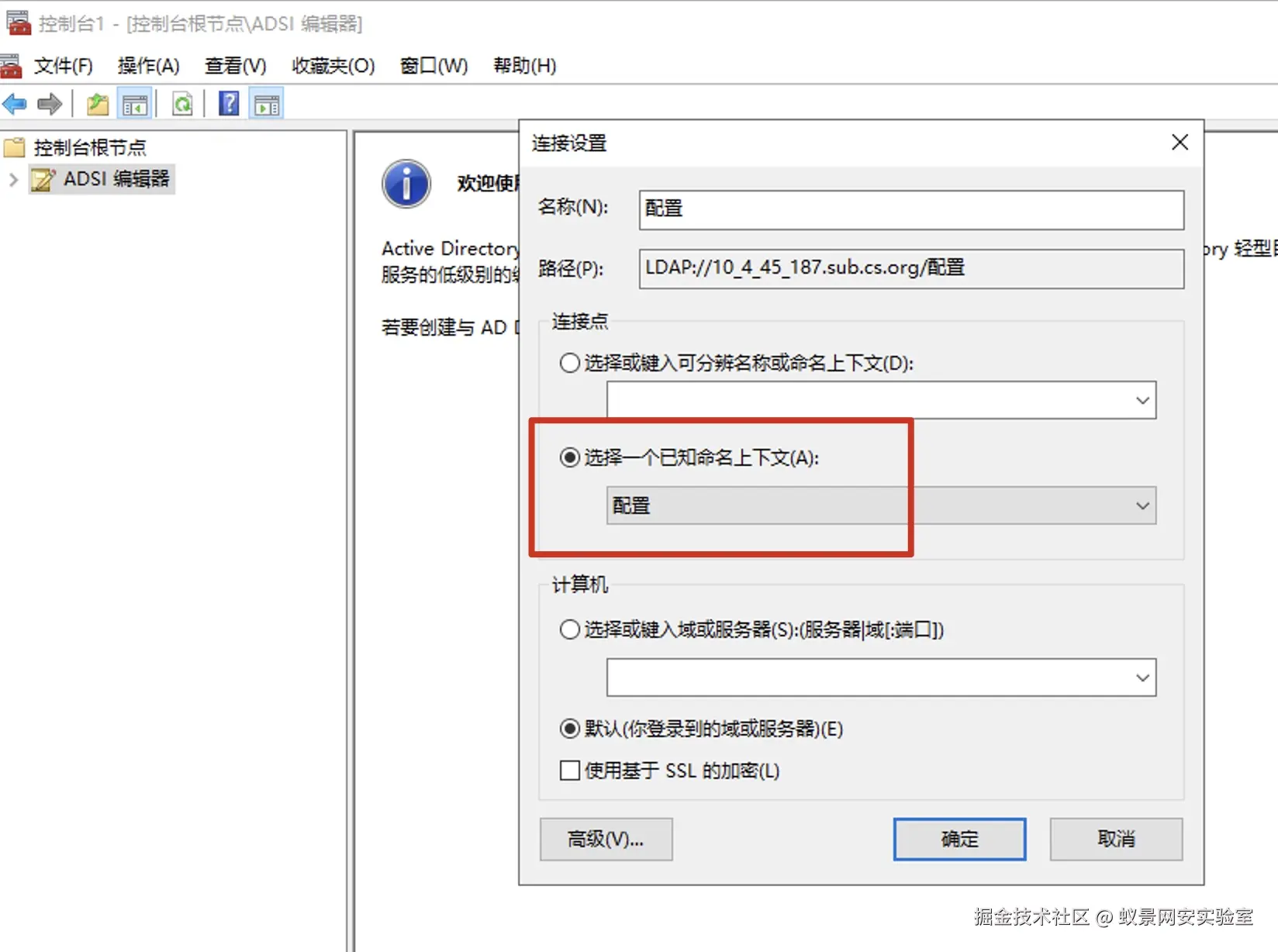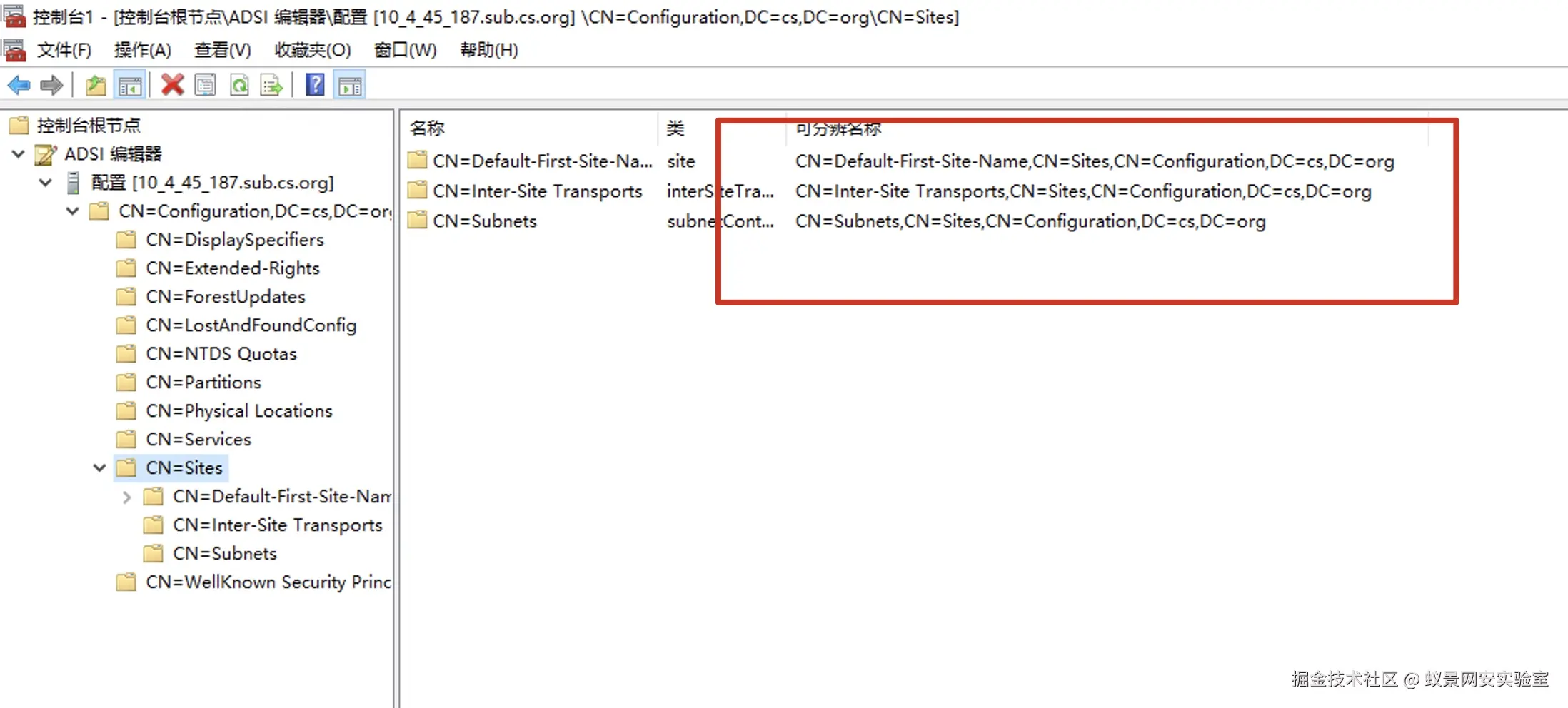 首先通过在子域的域控机器上打开mmc.exe->连接ADSI->配置来查看子域的配置命名上下文:
