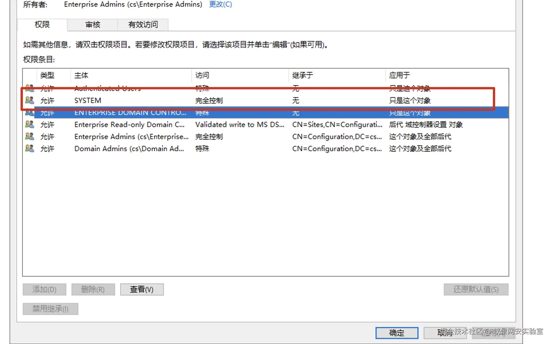 但是可以看到除了域用户、域管用户以外,还有一个特权ACL条目叫SYSTEM,该条目拥有完全控制权限: