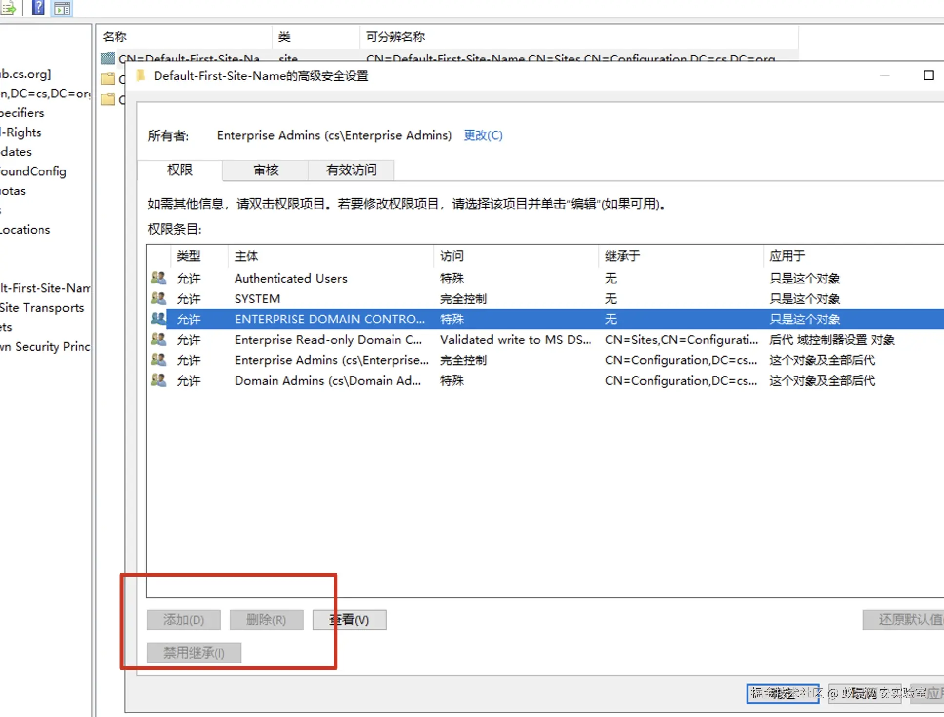 继续查看配置对象的安全描述符中的ACL,发现子域没有权限去变更: