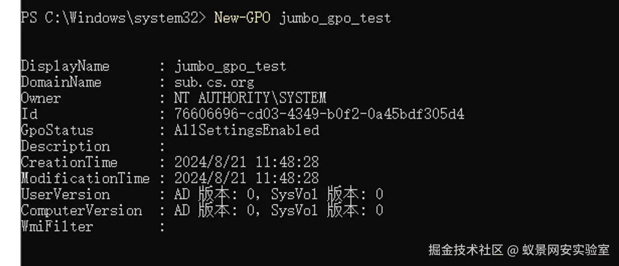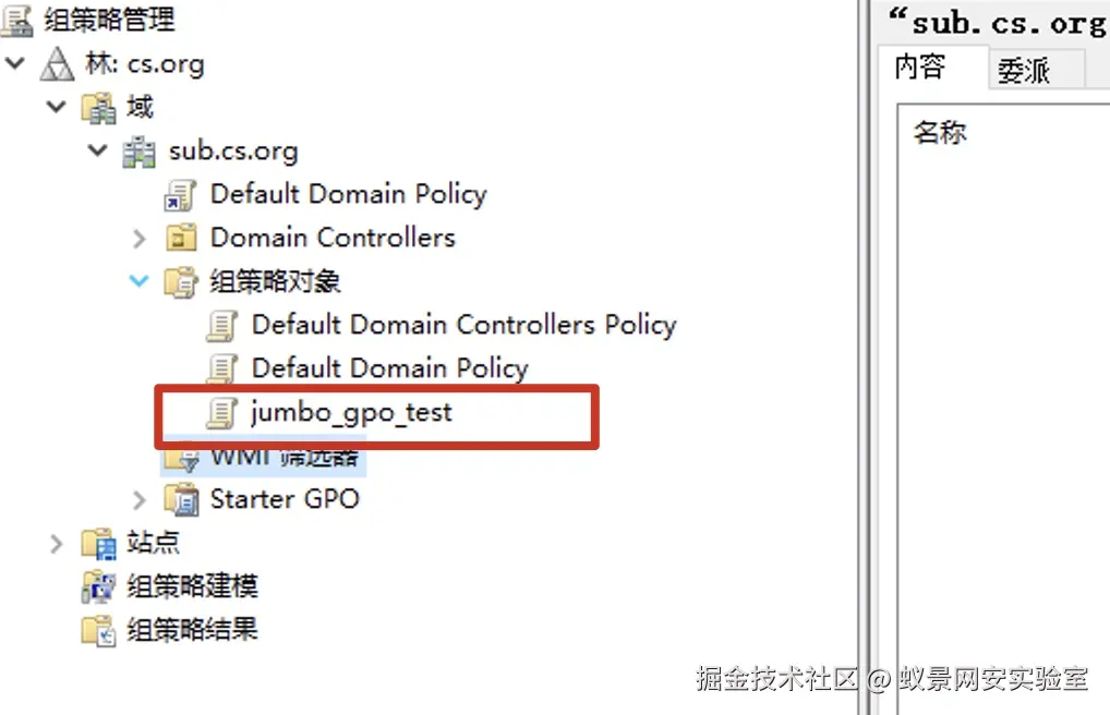 既然可以控制父域的配置命名上下文,那如何利用呢?网上提到有几种方式,一种是通过GPO、还有的是提到给父域添加一个自己可控的证书模板(ESC1),这里以GPO组策略为例。先在子域域控上创建一个GPO:
