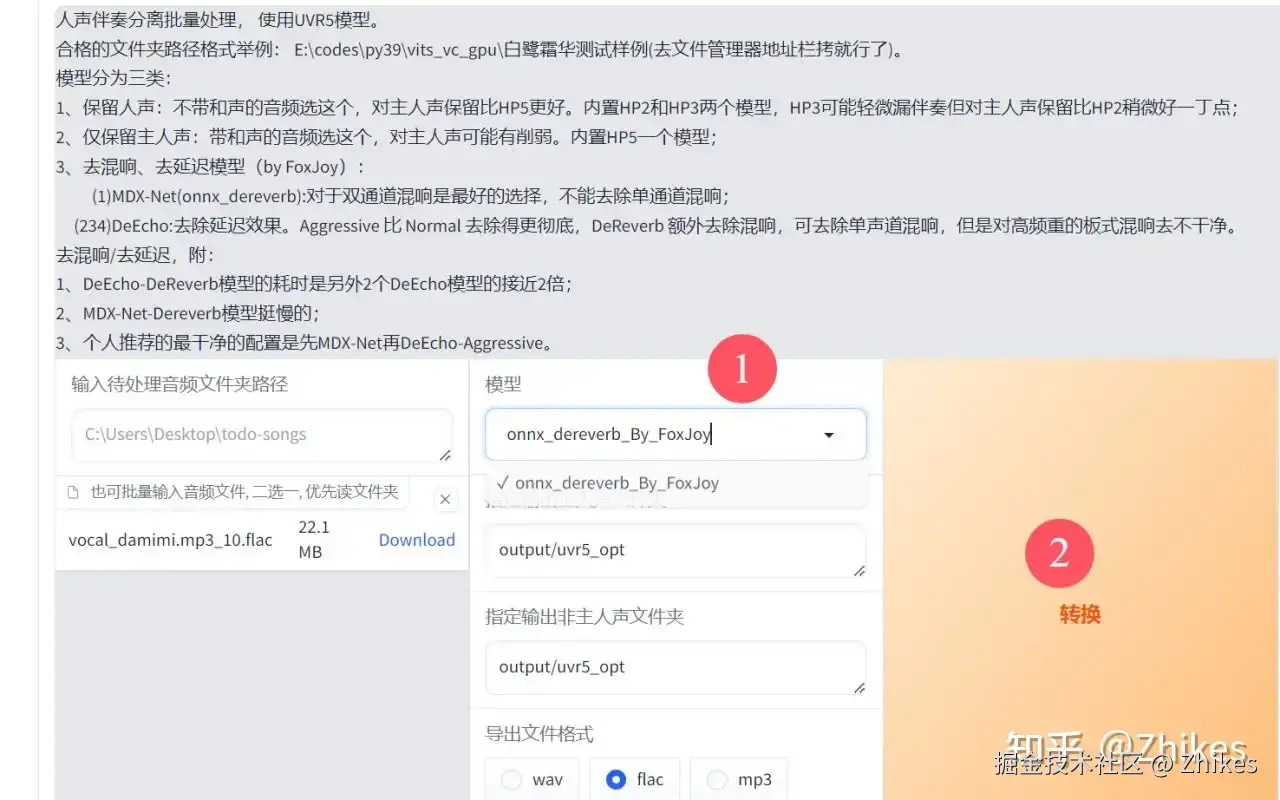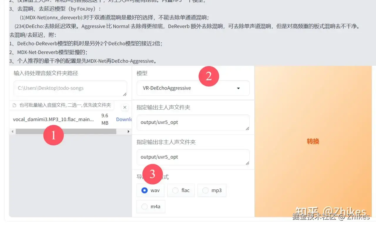 5.处理完后在输出目录又会多两个文件,再次进行VR-DeEcho-Aggressive处理。将后缀是flac_main_vocal.flac拖到文件选择框,下图已经标注,选择VR-DeEcho-Aggressive处理,导出文件格式 现在需要更改一下,不然等下难得找到,这里选择wav,不再是之前的flac格式