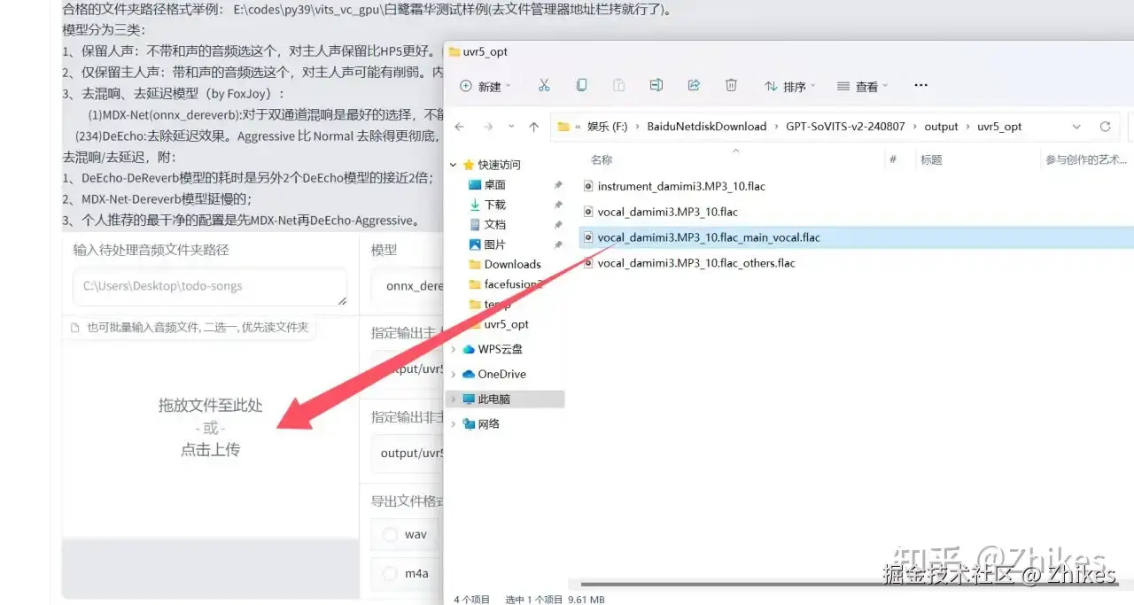 4.处理完后在输出目录会多两个文件,再次进行onnx_dereverb处理。将vocal开头的文件拖到文件选择框,选择onnx_dereverb处理