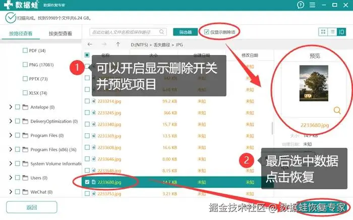 第三步:扫描结束后,你可以通过打开 【仅显示已删除项目】 的开关,或使用其他方法将需要恢复的数据确认。最后,选中这些项目,点击右下角的绿色按钮 【恢复】 ,选择一个与原始存储不同的路径保存文件。