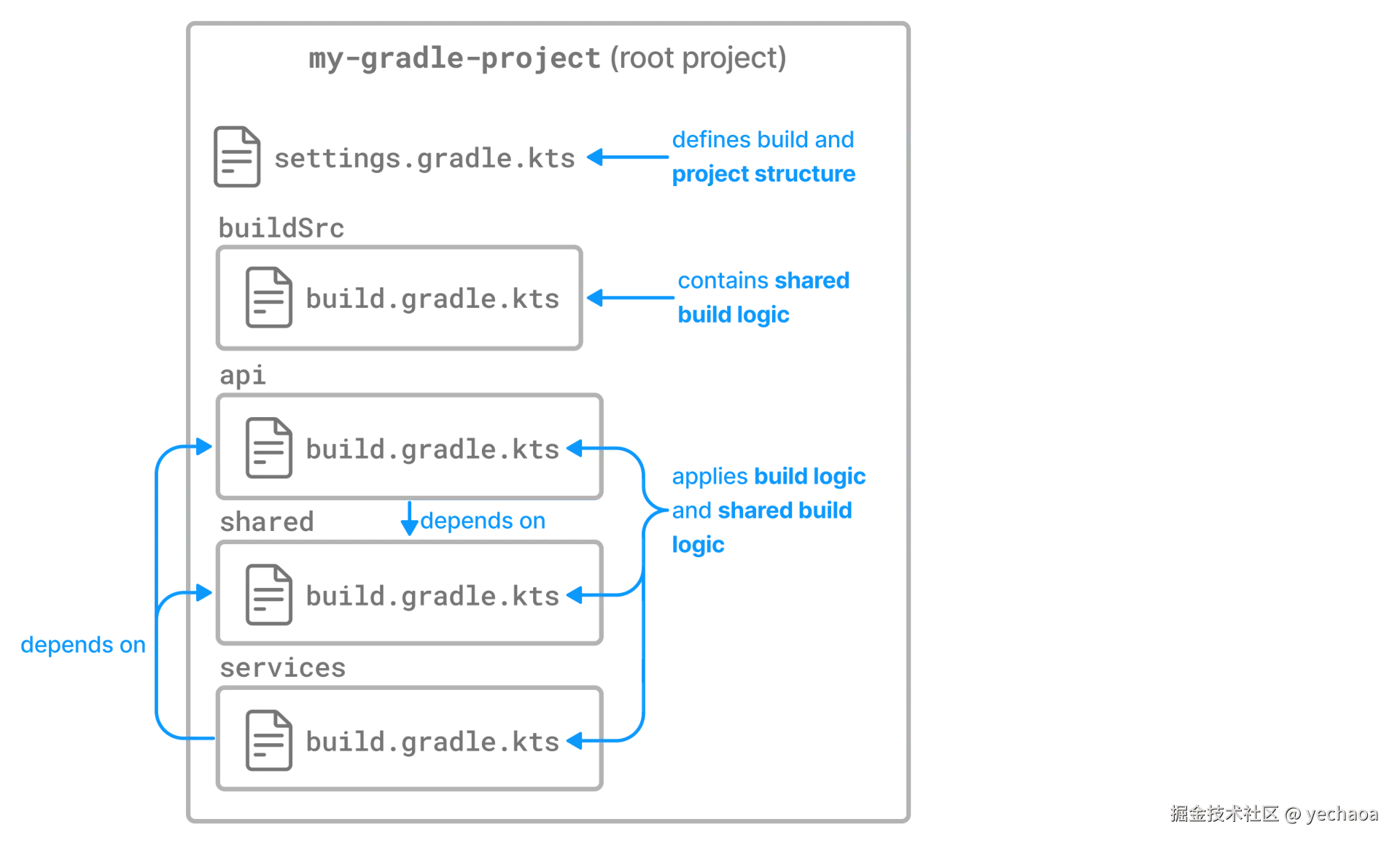 在构建时,Gradle识别到有buildSrc目录就会将其加入到构建流程中,因此buildSrc中定义的类、插件等都可以在项目的构建脚本中使用,不需要额外配置,我们可以理解它是一个专门为构建而生的独立模块。