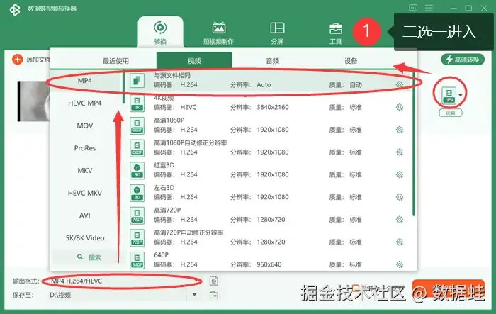 步骤二: 在页面底部,您将找到 【输出格式】 选项(或者您可以点击右侧的设置图标进行访问)。点击此选项后,您将跳转至视频输出设置页面。在此页面,您需要从大类中选择 【视频】 并将格式设置为 【mp4】 。为了确保输出视频的画质稳定,我们建议选择 【与源文件一致】 的选项。